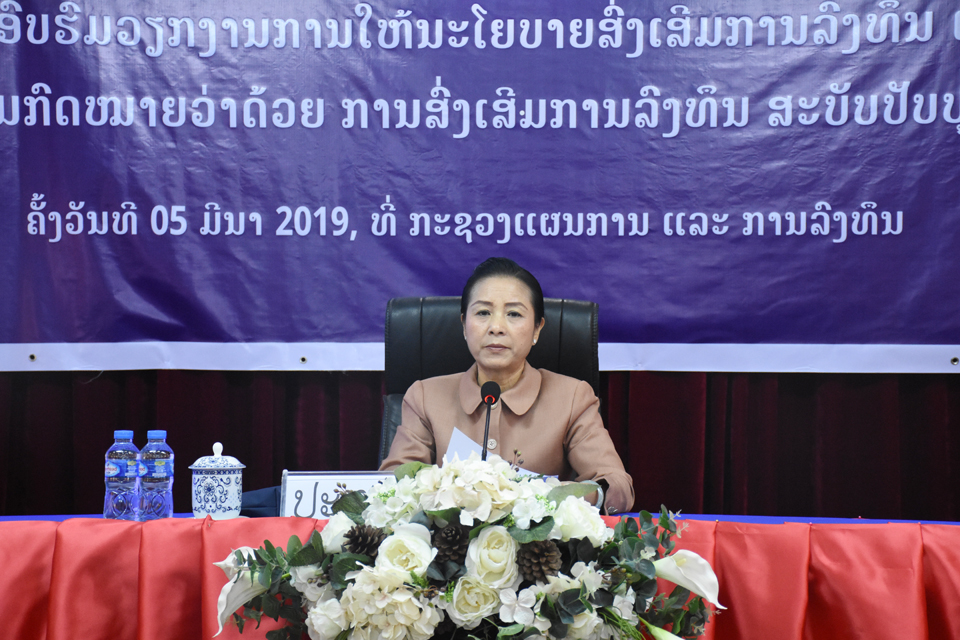 ກອງປະຊຸມຝຶກອົບຮົມວຽກງານການໃຫ້ນະໂຍບາຍສົ່ງເສີມການລົງທຶນ ແລະເຜີຍແຜ່ບາງມະຕິກໍາລຸ່ມກົດໝາຍວ່າດ້ວຍການສົ່ງເສີມການລົງທຶນ ແລະສະບັບປັບປຸງປີ 2016 ໄດ້ຈັດຂຶ້ນໃນວັນທີ 5 ມີນາ 2019 ທີ່ນະຄອນຫຼວງວຽງຈັນ ໂດຍການເປັນປະທານຂອງທ່ານ ນາງ ຄໍາຈັນ ວົງແສນບູນ ຮອງລັດຖະມົນຕີກະຊວງແຜນການ ແລະການລົງທຶນ, ທ່ານ ນາງ ແສງເດືອນ ໄຊຍະສອນ ຫົວໜ້າພະແນກ, ກົມສົ່ງເສີມການລົງທຶນກະຊວງແຜນການ ແລະ ການລົງ ທຶນ, ທ່ານ ໜອນແກ້ວ ດາລາວົງ