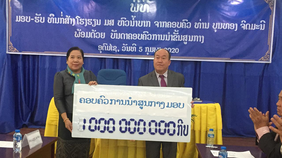 ໃນວັນທີ 5 ກຸມພາ ຜ່ານມາ ທີ່ຫ້ອງປະຊຸມໂຮງແຮມມິດຕະພາບແຂວງອຸດົມໄຊ ຄອບຄົວ ການນຳຂັ້ນສູນກາງນຳໂດຍທ່ານ ນາງ ບົວໄຫຼ ຈິດມະນີ ຄອບຄົວ ຂອງທ່ານ ບຸນທອງ ຈິດມະນີ ຮອງນາຍົກລັດຖະມົນຕີ ຄະນະກວດກາສູນກາງພັກພ້ອມດ້ວຍ ຄອບຄົວການນຳຂັ້ນສູນກາງ ແລະ ຍາດພີ່ນ້ອງໄດ້ນຳເອົາເງິນ