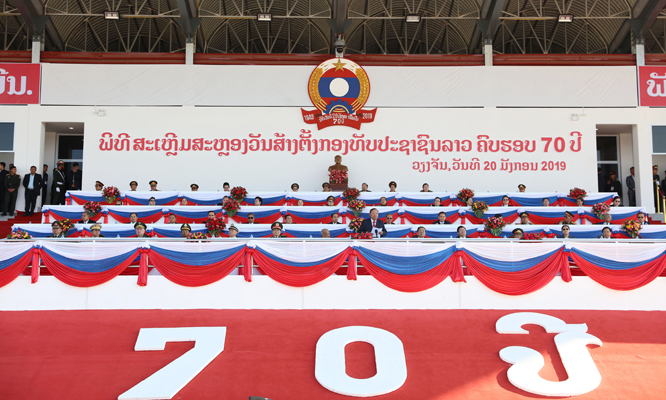 ພິທີສະເຫຼີມສະຫຼອງວັນສ້າງຕັ້ງກອງທັບປະຊາຊົນລາວຄົບຮອບ 70 ປີ ໄດ້ຈັດຂຶ້ນຢ່າງຍິ່ງໃຫຍ່ ແລະສົມກຽດໃນ ວັນທີ 20 ມັງກອນ 2019 ທີ່ວິທະຍາຄານກົມມະດຳ (ນ້ຳຊວງ) ເມືອງ ໂພນໂຮງ ແຂວງວຽງຈັນ ໂດຍໃຫ້ກຽດ ເຂົ້າຮ່ວມຂອງທ່ານ ບຸນຍັງ ວໍລະຈິດ ປະທານປະເທດແຫ່ງ ສປປ ລາວ, ທ່ານ ທອງລຸນ ສີສຸລິດ ນາຍົກລັດຖະມົນຕີ, ທ່ານ ພົນເອກ ຈັນສະໝອນ ຈັນຍາລາດ ລັດຖະມົນຕີກະຊວງປ້ອງກັນປະເທດພ້ອມດ້ວຍອະດີດການນຳຂັ້ນສູງ, ບັນດາການນຳພັກ-ລັດ, ບັນດາຜູ້ຕາງໜ້າຈາກອົງການຈັດຕັ້ງສາກົນ ແລະມວນຊົນເຂົ້າຮ່ວມຢ່າງຫຼວງຫຼາຍ.