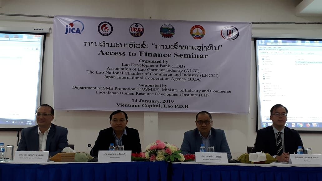 ສະພາການຄ້າ ແລະອຸດສາຫະກໍາແຫ່ງຊາດລາວ (ສຄອຊ) ຮ່ວມກັບທະນາຄານພັດທະນາລາວ (ທພລ) ໄດ້ຈັດສໍາມະນາພາຍໃຕ້ຫົວຂໍ້ “ການເຂົ້າຫາແຫຼ່ງທຶນຂອງທຸລະກິດ” ຊຶ່ງຈັດຂຶ້ນທີ່ ສຄອຊ ນະຄອນຫຼວງວຽງຈັນ ໃນວັນທີ 14 ມັງກອນ 2019 ໂດຍການໃຫ້ກຽດເຂົ້າຮ່ວມຂອງທ່ານ ດາວອນ ພະຈັນທະວົງ ຮອງປະທານ ສຄອຊ; ທ່ານ ອາຄົມ ປຣະເສີດ ຜູ້ອໍານວຍການໃຫຍ່ ທພລ; ທ່ານ ກິ່ງໄຊ ຈຸລະມົນຕີ ຫົວ ໜ້າພະແນກຄຸ້ມຄອງກອງທຶນວິສາຫະກິດຂະໜາດນ້ອຍ ແລະ ຂະໜາດກາງ