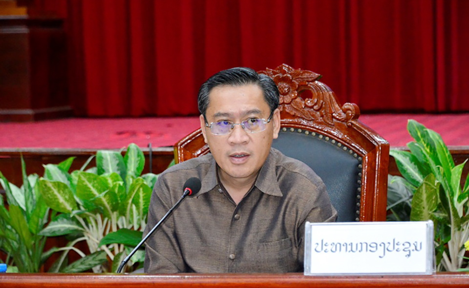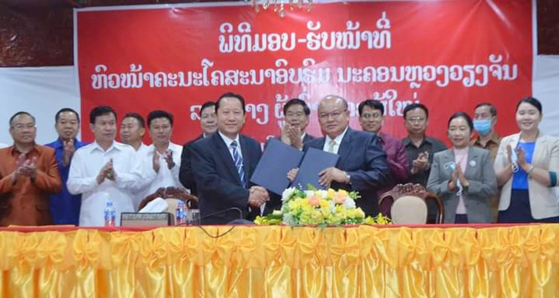 ພິທີມອບ-ຮັບໜ້າທີ່ລະຫວ່າງທ່ານ ພູວົງ ວົງຄໍາຊາວ ຫົວໜ້າໂຄສະນາອົບຮົມນະຄອນຫຼວງວຽງຈັນ (ນວ) ຜູ້ເກົ່າ ແລະທ່ານ ຊົງເລົ່າ ຢົງນູ ຫົວໜ້າຄະນະໂຄສະນາອົບຮົມ ນວ ຜູ້ໃໝ່ມີຂຶ້ນໃນວັນທີ 22 ກຸມພາ 2021 ທີ່ຫ້ອງວ່າການປົກຄອງ ນວ