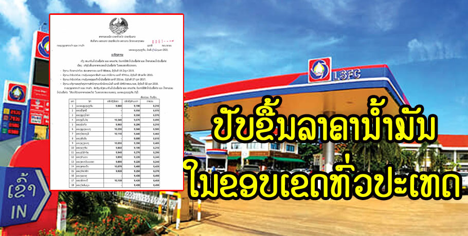 ກະຊວງອຸດສາຫະກຳ ແລະການຄ້າໄດ້ອອກແຈ້ງການປັບຂຶ້ນລາຄານໍ້າມັນເຊື້ອໄຟຂາຍຍ່ອຍໜ້າປໍ້າທົ່ວປະເທດເລີ່ມມີຜົນນັບແຕ່ເວລາ 6:00 ຂອງວັນທີ 5 ກຸມພາ