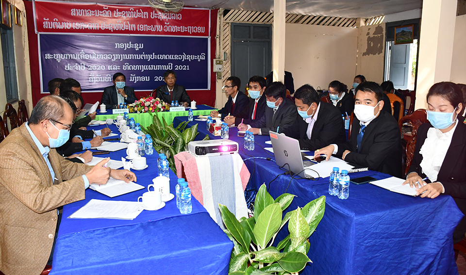 ກອງປະຊຸມສະຫຼຸບວຽກງານການຕ່າງປະເທດປະຈໍາປີ 2020 ແລະທິດທາງແຜນການປີ 2021 ໄດ້ຈັດຂຶ້ນໃນວັນທີ 7 ມັງກອນ 2021 ທີ່ຫ້ອງປະຊຸມພະແນກການຕ່າງປະເທດແຂວງໄຊຍະບູລີ ໂດຍການເປັນປະທານຂອງທ່ານ ລືໄຊ ພະດວງເດດ ຫົວໜ້າພະແນກການຕ່າງປະເທດແຂວງ,