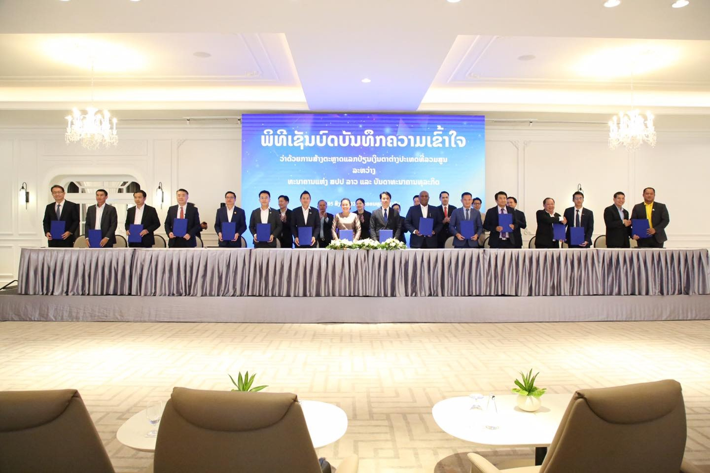 ພິທີເຊັນບົດບັນທຶກຄວາມເຂົ້າໃຈວ່າດ້ວຍການສ້າງຕະຫຼາດແລກປ່ຽນເງິນຕາຕ່າງປະເທດທີ່ລວມສູນ ລະຫວ່າງ ທະນາຄານແຫ່ງ ສປປ ລາວ (ທຫລ) ແລະ ທະນາຄານທຸລະກິດ (ທທກ)