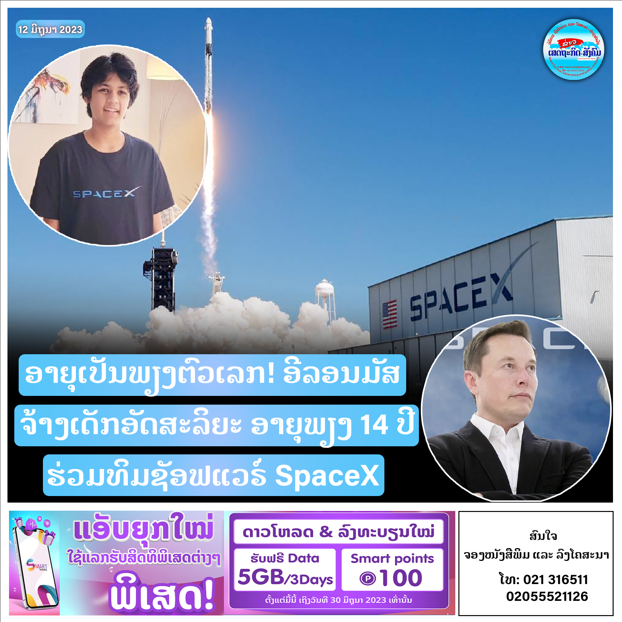 ບໍລິສັດ ສະເປດ ເອັກຊ໌ (SpaceX) ຜູ້ຜະລິດຍານອາວະການຍັກໃຫຍ່ ຊຶ່ງເຈົ້າຂອງແມ່ນ ອີລອນມັສ, ເສດຖີອັນດັບໜຶ່ງຂອງໂລກໃນປັດຈຸບັນໄດ້ຮັບພະນັກງານໃໝ່ອາຍຸພຽງ 14 ປີເທົ່ານັ້ນ ເຂົ້າມາເຮັດວຽກຮ່ວມກັບທິມວິສະວະກໍາຊັອຟແວຣ໌ຂອງບໍລິສັດ.