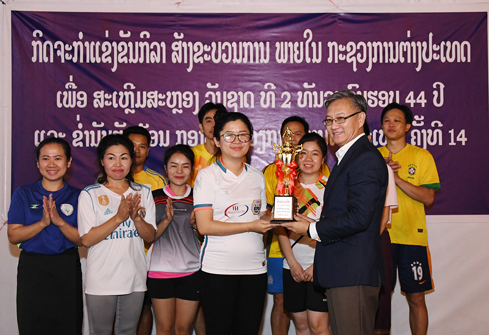 ເມື່ອອາທິດຜ່ານມາ ທີ່ເດີ່ນບານເຕະກູ໊ດໄລ ນະຄອນຫຼວງວຽງຈັນ, ກະຊວງການຕ່າງປະເທດໄດ້ຈັດກິດຈະກໍາແຂ່ງຂັນກີລາບານ ເຕະຍິງ-ຊາຍ ຂຶ້ນເພື່ອສ້າງຂະບວນ ການຂໍ່ານັບຮັບຕ້ອນວັນຊາດທີ 2 ທັນວາ 2019 ຄົບຮອບ 44 ປີ