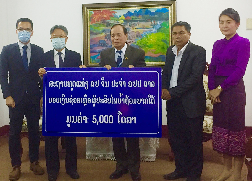 ສະຖານເອກອັກຄະລັດຖະທູດ ສປ ຈີນ ປະຈໍາ ສປປ ລາວ ໄດ້ນຳເອົາປັດໄຈມູນຄ່າ 5 ພັນໂດລາສະຫະລັດ (ປະມານ 46 ກວ່າລ້ານກີບ) ມອບໃຫ້ອົງການກາແດງລາວເພື່ອປະກອບສ່ວນຊ່ວຍເຫຼືອຜູ້ປະສົບໄພນໍ້າຖ້ວມຢູ່ບັນດາແຂວງພາກໃຕ້ຂອງລາວ, ຊຶ່ງເຮັດໃຫ້ເນື້ອທີ່ການຜະລິດ, ເຮືອນຊານບ້ານຊ່ອງ, ສັດລ້ຽງ ແລະໄຮ່ນາ