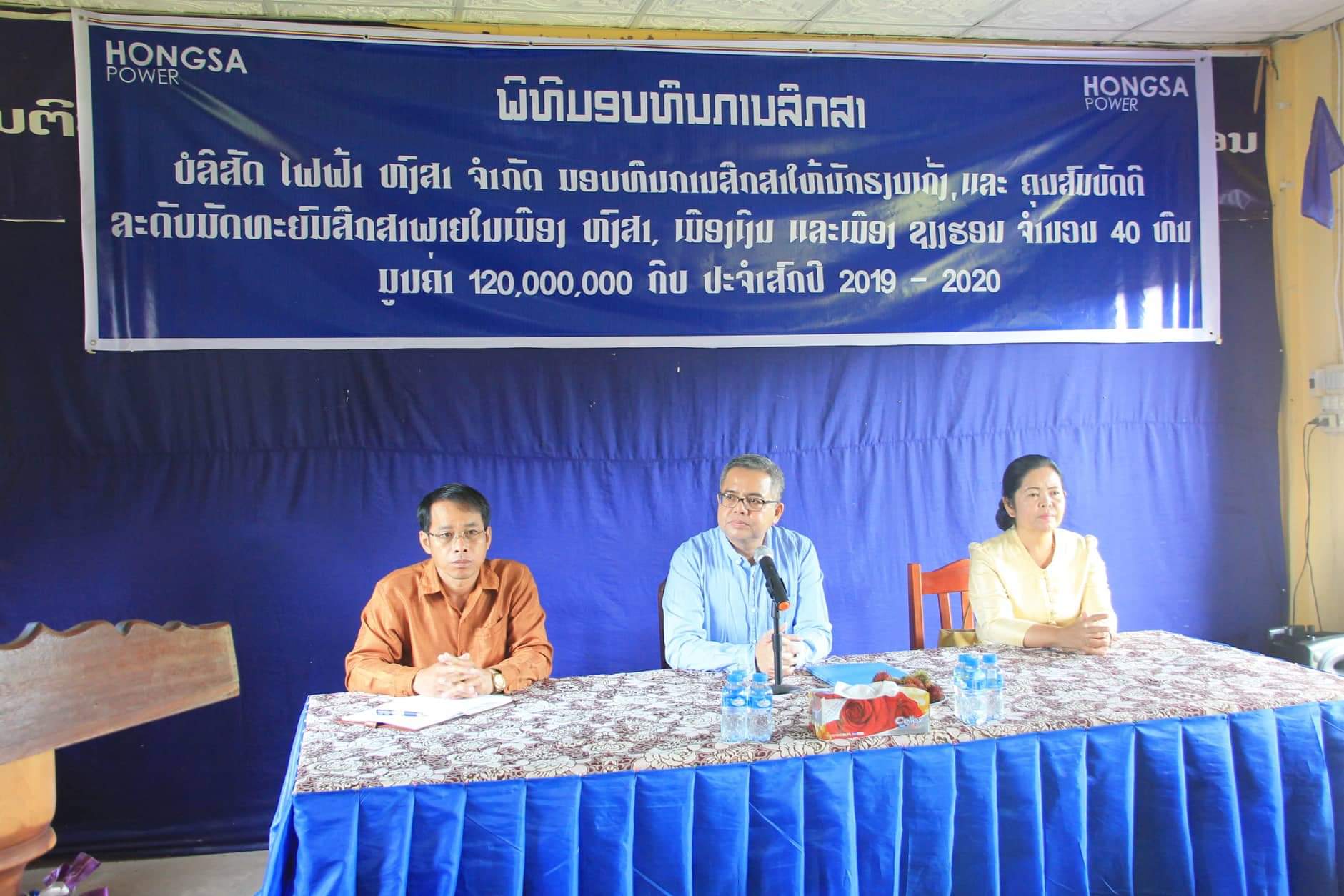 ວັນທີ 25 ກັນຍາ 2019 ບໍລິສັດໄຟຟ້າຫົງສາ ຈໍາກັດໄດ້ຈັດ ພິທີມອບທຶນການສຶກສາໃຫ້ແກ່ ນ້ອງນັກຮຽນຊັ້ນມັດທະຍົມທີ່ຮຽນດີ-ຮຽນເກັ່ງ ແລະມີຄຸນສົມບັດດີທີ່ຫ້ອງປະຊຸມຂອງຫ້ອງການສຶກສາທິການ ແລະກີລາເມືອງຫົງສາ ແຂວງໄຊຍະບູລີ ໂດຍມີທ່ານ ຄະທາຢຸດຊູພູນຜູ້ອຳນວຍການໃຫຍ່ ບໍລິສັດ