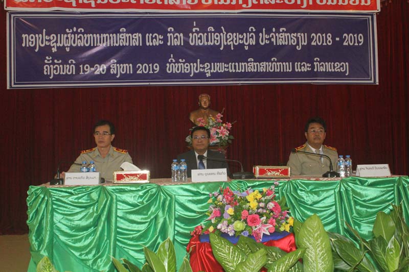 ກອງປະຊຸມຜູ້ບໍລິຫານການ ສຶກສາ ແລະກີລາເມືອງໄຊຍະບູລີ ໄດ້ຈັດຂຶ້ນໃນລະຫວ່າງວັນທີ 19- 20 ສິງຫາ 2019 ໂດຍການ ເປັນປະທານຂອງທ່ານ ຈັນທະວີວັນນະພາຜົນຫົວໜ້າຫ້ອງການ ສຶກສາທິການ ແລະກີລາເມືອງໄຊຍະບູລີ, ໃຫ້ກຽດເຂົ້າຮ່ວມຂອງ ທ່ານ ບຸນແທນ ທິແກ້ວ ເຈົ້າເມືອງໄຊຍະບູລີ,