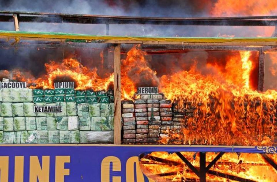 ຕຳຫຼວດມຽນມາເຜົາທຳລາຍຢາເສບຕິດທີ່ຢຶດມາໄດ້ລວມມູນຄ່າ108 ລ້ານໂດລາສະຫະລັດໃນນະຄອນຢາງກຸ້ງ,ເມືອງມັນທະເລ ແລະຕອງຈີໃນວັນທີ 26 ມິຖຸນາທີ່ຜ່ານມາເນື່ອງໃນວັນຕໍ່ຕ້ານຢາເສບ ຕິດໂລກ.